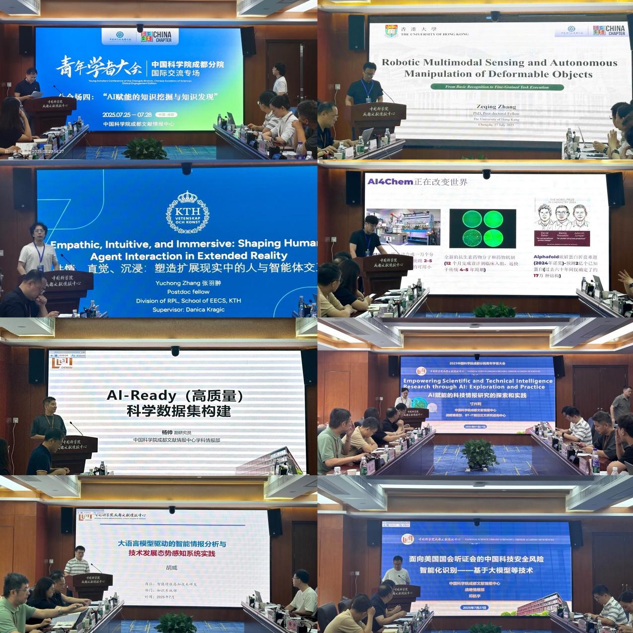 香港大学博士后研究员张泽卿阐述了多模态感知技术如何赋能机器人精准识别可变性物体并自主执行复杂操控任务。瑞典皇家理工学院博士后研究员张羽翀探讨了在扩展现实(XR)中构建具备共情能力、直觉式交互和深度沉浸感的人机智能体交互范式。美国纽约大学徐聿智博士介绍了利用分子结构信息驱动的深度学习模型在加速新分子设计与化学发现的研究应用。成都文献情报中心四位青年学者分享了研究进展:杨帅副研究员阐述了面向科学研究的AI-ready科学数据集构建方法;寸兴利副研究员介绍了AI技术在科技情报分析中的创新应用;特别研究助理胡威、邓航宇分别聚焦于运用大语言模型实现技术演进动态的实时感知以及对美国国会听证会信息的智能化挖掘研判。与会青年学者结合科研实践进行了深度交流与讨论。